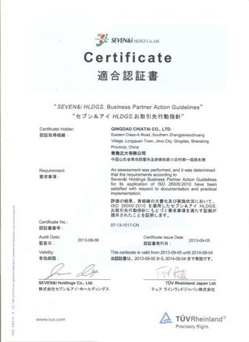 據客戶介紹,本次國內有七家企業參加此項CSR認證,僅兩家通過,一家是河北規模較大的板栗生產企業,另一家就是青島正大有限公司。 |